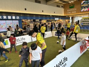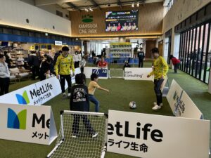 当日は芝生広場にフットサルのミニコートを設置し、選手との2 on 2 やPK対決など、気軽にフットサルを体験していただきました。